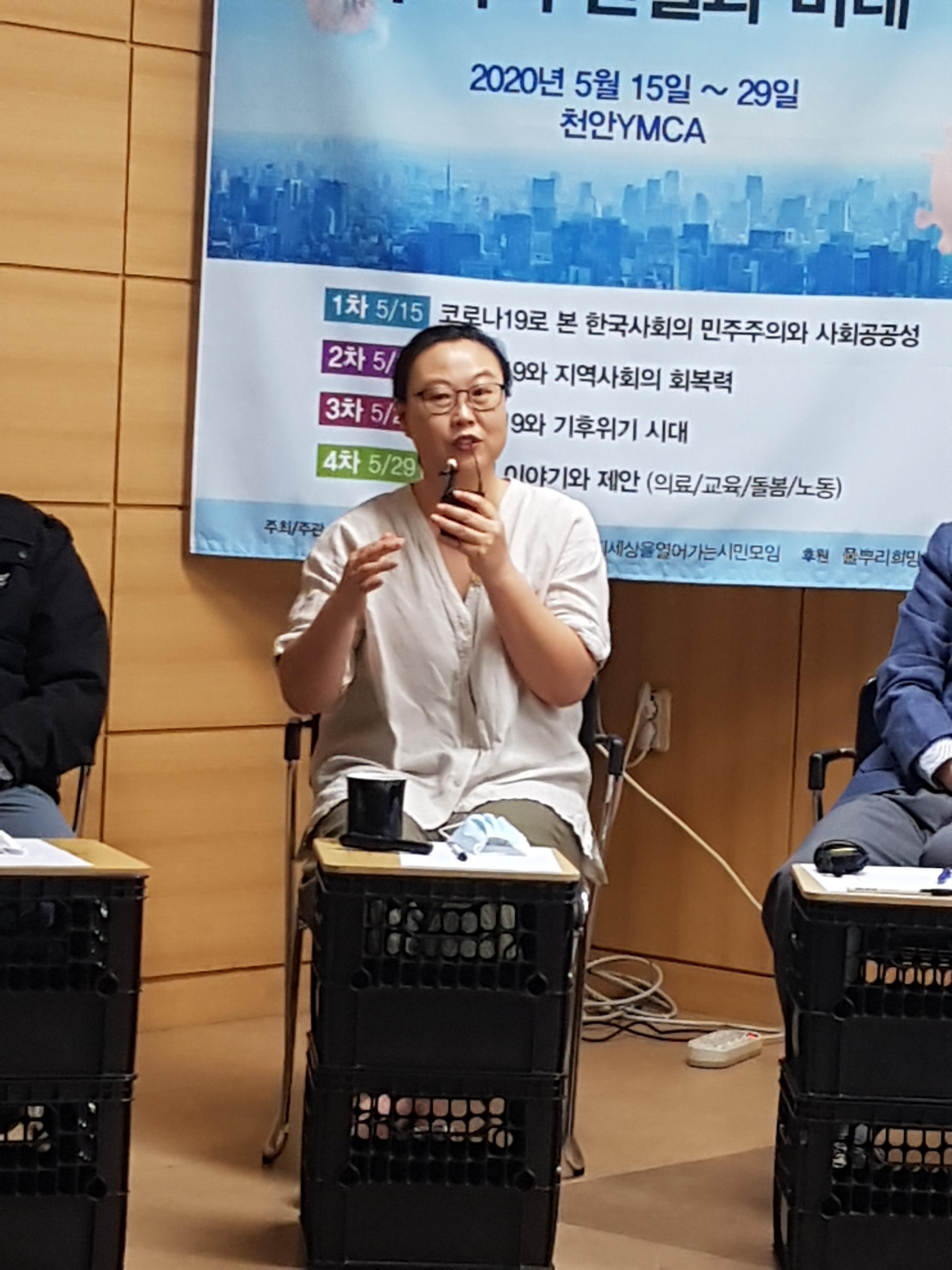 코로나 감염이 발생하면서 역학조사가 시작됐는데 초기의 역학조사와 지금은 차이가 있다. 불필요한 정보 수집에 대한 시민들과 인권단체의 문제제기로 변화됐다. 2015년 메르스 사태 때는 국가만 보였지만 이번 코로나 국면에서는 지방정부의 대응과 역할, 드물게는 마을단위의 역할도 볼 수 있었다. 이것은 우리가 가만히 있지 않고 준비하고, 대응하고, 문제제기 하면서 새로운 힘을 만드는 과정에서 변화가 있었다고 본다. 아무런 목소리를 내지 못했다면 지금도 2월과 같은 역학조사가 이뤄지고 있었을 것이다. 물론 카메라로 생중계되는 자리가 어색하기도 했지만 이런 대화가 계속 이어지기를 바란다. 코로나 이후도 중요하지만 코로나를 겪었던 지난 몇 달 그리고 지금에 대한 얘기를 더 많이 했으면 좋겠다는 생각이다. 그래야 이후를 더 잘 대응할 수 있을 것이라 본다. 코로나를 극복해 가는 힘은 연대에 있다고 본다. 포르투갈의 경우 코로나 시기 난민과 이주민 등에 대해 일시적으로 국적을 부여한 사례, 독일이 프랑스와 이탈리아의 중증환자들을 자국 병상에 수용했던 모습, 쿠바가 23개국에 1400여명의 보건의료진을 지원한 사례, 우리나라도 6.25 참전국 22개국에 마스크를 지원한 사례, 대구와 광주가 연대한 사례가 돋보였다. 서로 연결하고 연대하는 힘이 발휘될 때 위기를 극복하고 회복력을 갖게 되지 않을까 생각하면서 오늘 수고해주신 네 분의 발표자들과 온/오프라인에서 참여해주신 많은 시민들, 주최해주신 천안YMCA, 복지세상을열어가는시민모임, 천안녹색소비자연대, 풀뿌리희망재단에도 감사드린다.