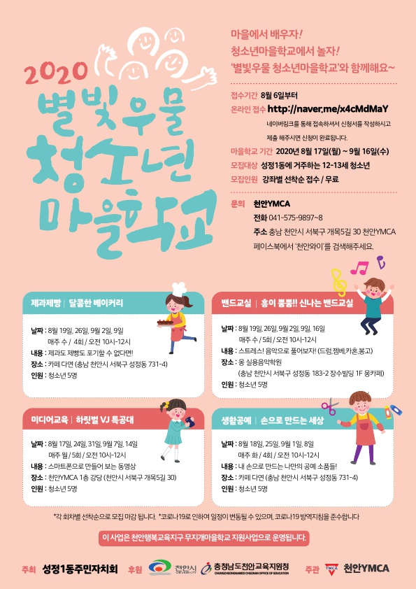천안YMCA와 성정1동 주민자치회는 오는 8월 17일부터 9월 16일까지 2020 별빛우물 청소년 마을학교 ‘마을에서 배우자! 청소년마을학교에서 놀자! ‘별빛우물 청소년마을학교’와 함께해요 ~