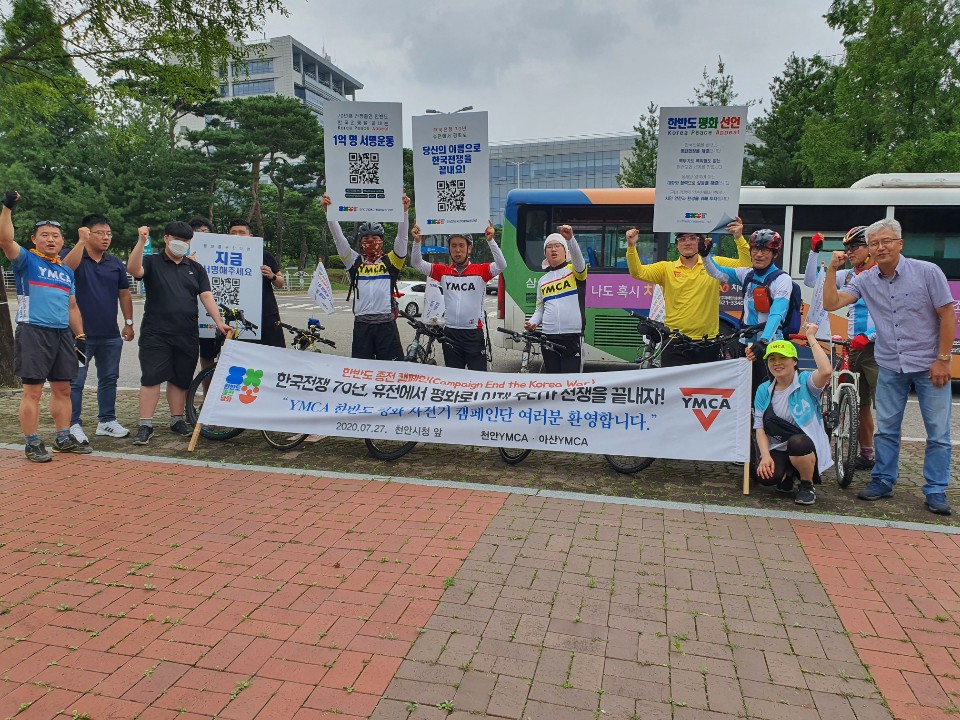 7월 27일 오전 세종시청 앞에서 'YMCA가 두바퀴로 그리는 한반도 평화' 발대식을 개최하고, '한반도 종전 캠페인'을 시작하여 천안시청까지 총 78.3KM의 거리를 이동한 세종YMCA의 회원들을 응원하기 위해 천안YMCA 박진용사무총장과 김지희 간사, 아산YMCA 이영석사무총장이 함께 했습니다.