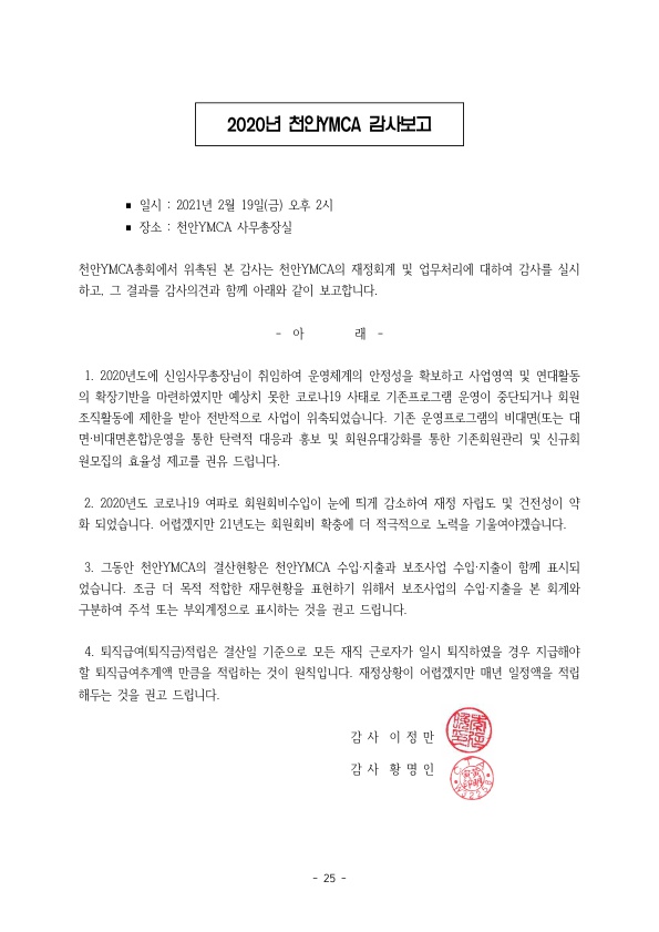 천안YMCA 살림살이를 보고드립니다. 본문