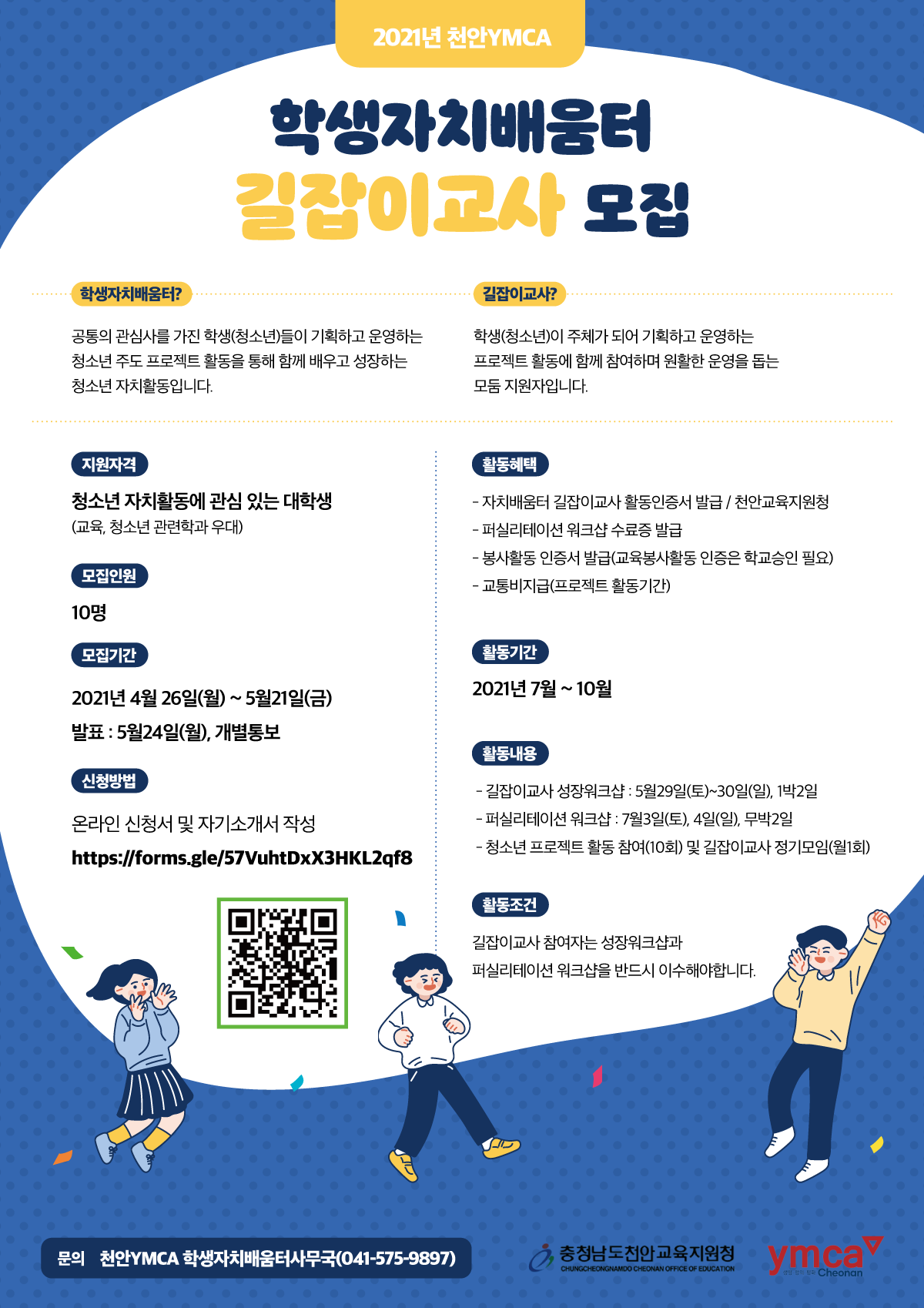 청소년들이 기획하는 다양한 자치활동을 통해 지역사회를 배우고 성장하는 학생자치배움터의 길잡이교사를 모집합니다. 청소년들과 함께 성장하며 청소년 교육과 지도의 경험을 쌓고 싶은 대학생들의 많은 관심과 참여를 바랍니다.