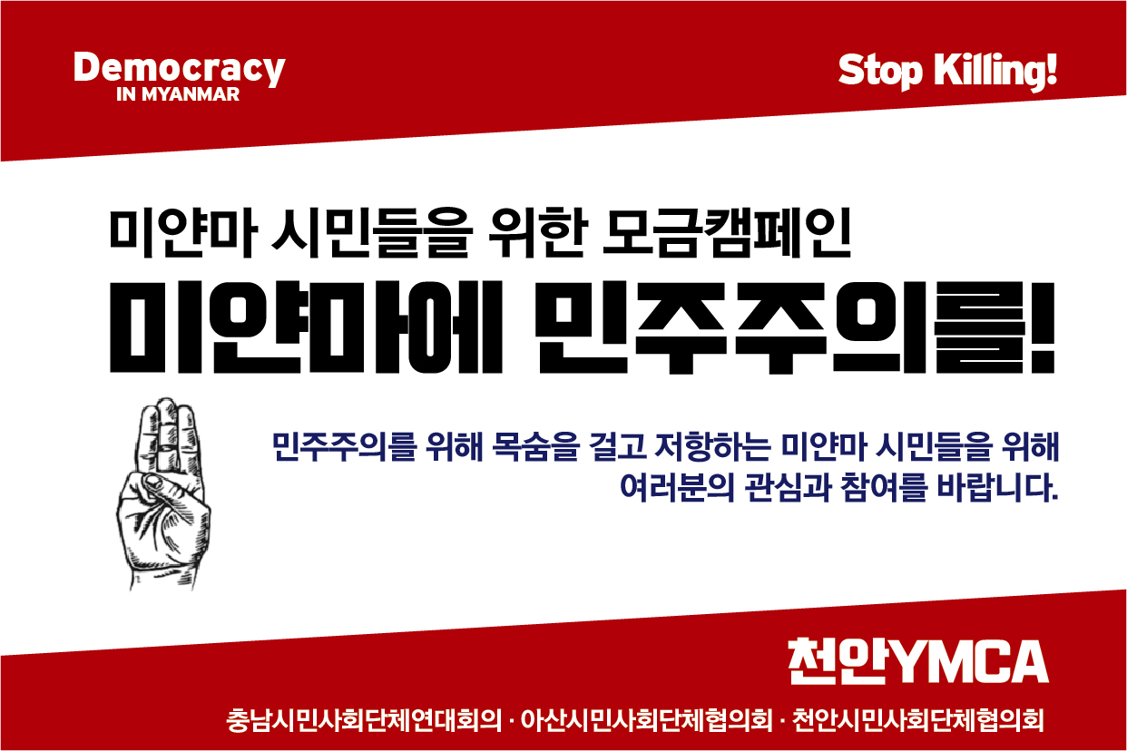 지난 2월 미얀마 군부의 쿠데타 이후 수많은 미얀마 청년, 시민들의 희생이 이어지고 있는 가운데 충남시민사회단체연대회의, 천안시민사회단체협의회, 아산시민사회단체협의회는 지난 4월 한 달간 미얀마 시민들을 위한 모금캠페인을 진행하고 258명의 시민(단체)들의 참여로 13,160,000원을 모금하고 캠페인 홍보 및 참가자 리워드(마스크) 제공비용 1,144,000원을 제외한 12,016,000원을 해외주민운동연대를 통해 미얀마에 전달할 예정입니다.