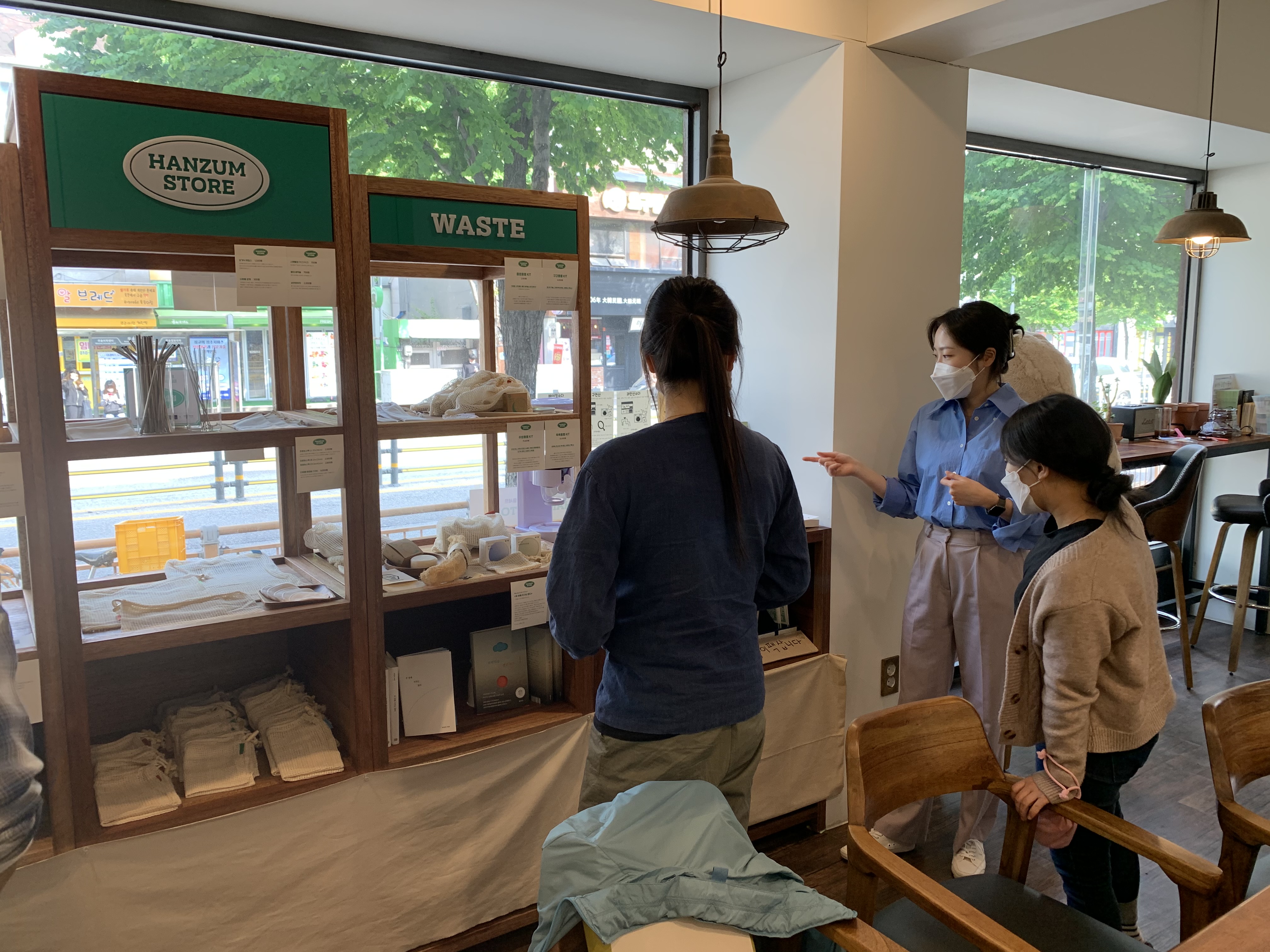 두번째로 방문한 곳은 사회적협동조합 혁신청입니다. 사회적협동조합 혁신청은 고체치약, 친환경 수세미, 화장솜, 비누, 다목적랩, 삼베 커피필터등 친환청 제품을 전시하여 공유상점을 운영하고 있었습니다. 그리고 일회용품을 사용하지 않는 친환경 커피숍도 같은 공간에서 운영을 하고 있었습니다. 한 공간을 다양한 방식으로 운영하고 있는 모습을 보니 신기했고, 하나의 공간을 이렇게 사용할 수도 있구나 라는 생각이 들었습니다. 올해부터는 플라스틱을 재활용하여 새활용품을 제작하는 사업도 진행하고 있다고 했었습니다. 아직 초기 단계라서 다양한 새활용품을 제작하지는 못하지만 지역에서 쓸수 있는 지역화폐로써 플라스틱 동전을 만들어서 지역에서 활용 가능한 화폐를 만들어 다양한 소비 활성화를 모색하고 있다고 합니다.