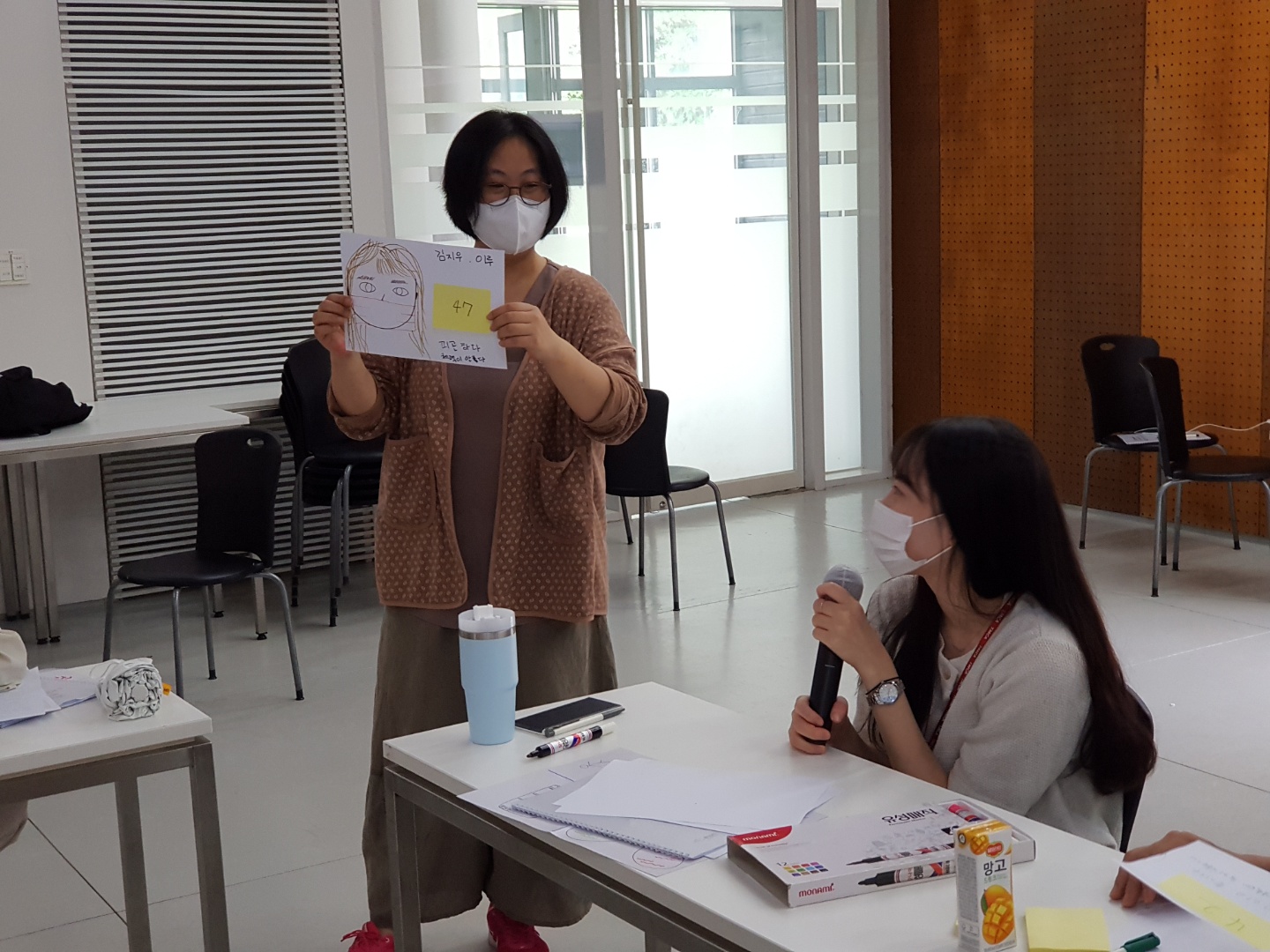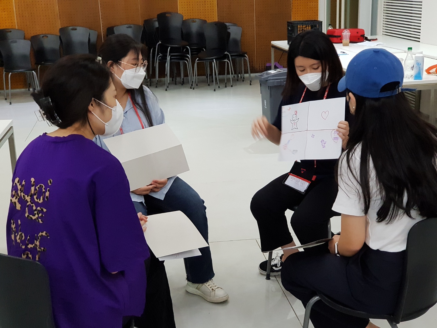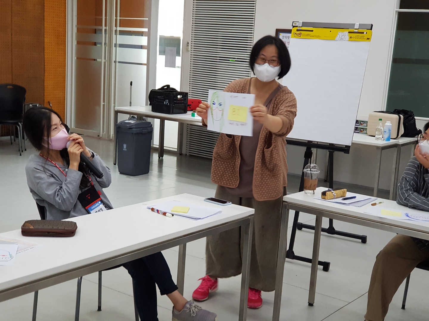이후에는 그림으로 자신의 특성을 표현하는 활동을 했습니다. 그리고 자신이 그린 그림을 바탕으로 4인 1조로 그룹을 형성하여 그룹의 인원들과 함께 자신이 그림을 설명하며 서로 공유하는 시간을 가졌습니다.