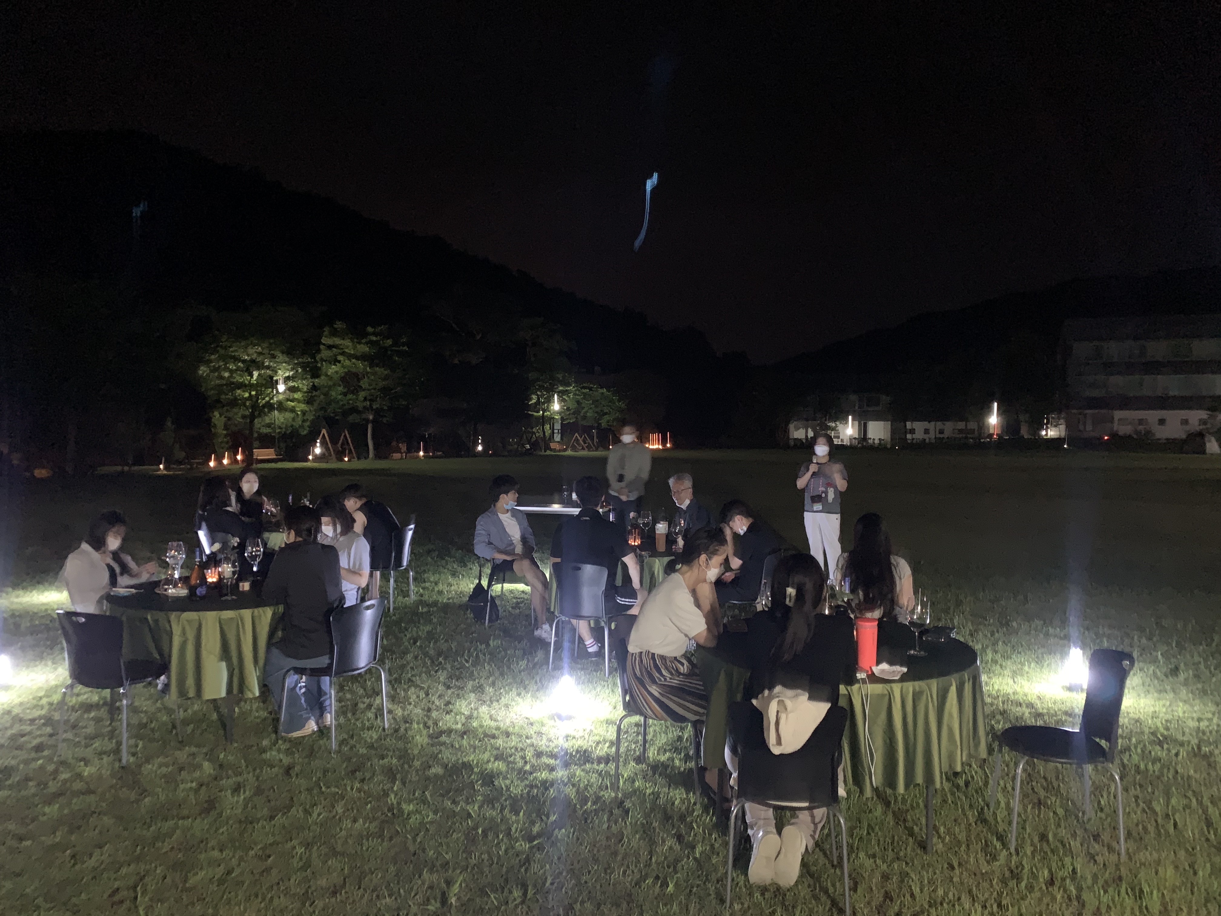 저녁에는 한국문화연수원의 잔디광장에서 다같이 진솔한 이야기를 나눠볼수 있는 시간을 가졌습니다. 우아한 분위기와 감성있는 음악을 틀어놓고 조별로 와인을 함께 마시며 오늘 진행했던 프로그램에 대한 이야기와 자신에 대해서 내면에 있는 진솔한 이야기를 하였습니다.